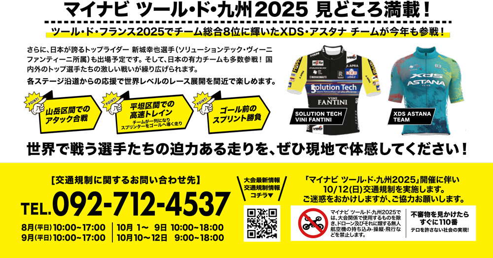 マイナビ ツール・ド・九州2025は、世界トップレベルの選手たちが九州を舞台に熱戦を繰り広げる国際サイクルロードレース!UCI(国際自転車競技連合)公認の大会として、2025年10月10日(金)から13日(月・祝)にかけて、長崎・福岡・熊本・宮崎・大分の5県で開催されます!